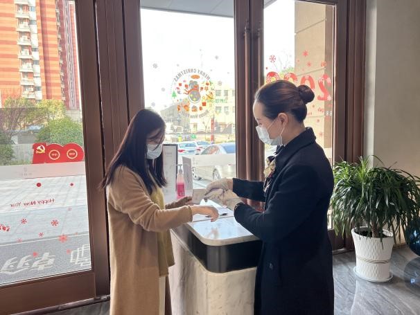 工作人员上岗前都进行体温检测登记、全方位自检自察。特殊时期,售楼处严格执行防疫流程,在入口处安排专人专岗,设置案场“健康保障大使”,严格把控入口安全,逐一检查核酸绿码,做好测温登记工作,并贴心为来访客户准备口罩和消毒酒精,确保每一位进出客户的健康安全。