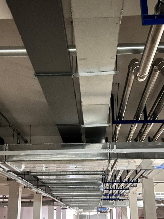 二是最大化保证净高。最大化保留净高尺度,提升地下空间的开敞体验感。主要做法:首先是将主管道贴梁设置,其次是消防喷淋等支管采用梁上预埋套管穿梁设置,在局部梁截面较大位置采用结构梁部分上翻抬高梁下净高等的方式,对空间占用进行合理布局,确保空间净高达到2.6米以上。